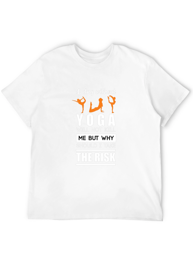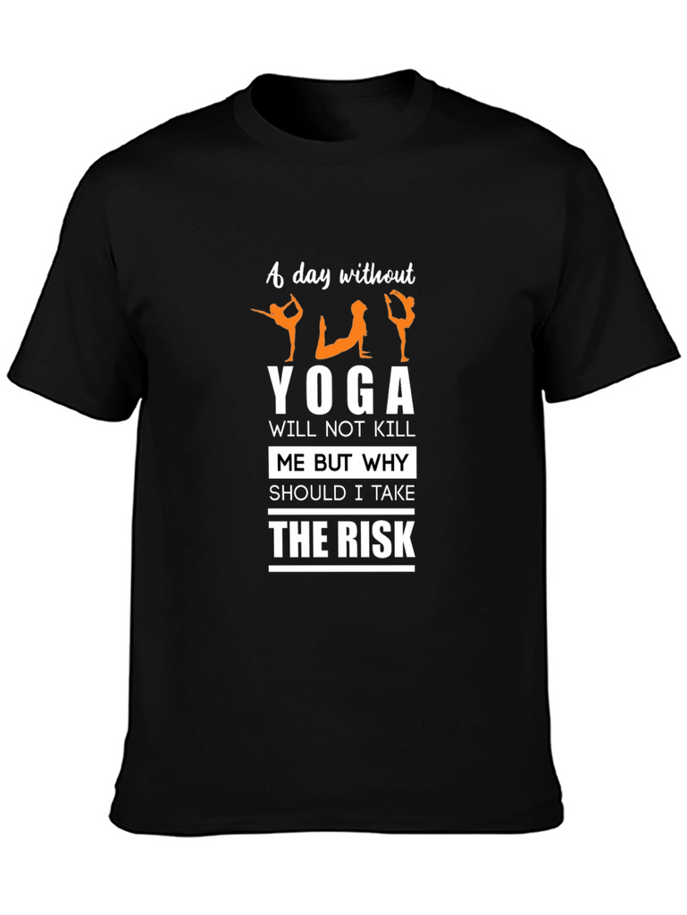 This stylish black t-shirt is perfect for yoga enthusiasts. Featuring a playful design with yoga poses and the humorous message "A day without YOGA WILL NOT KILL ME BUT WHY SHOULD I TAKE THE RISK", it's sure to be a conversation starter. Made from a comfortable-looking fabric, this tee is ideal for casual wear, yoga class, or lounging at home. Show off your love for yoga with this unique and expressive t-shirt. Makes a great gift for the yogi in your life!