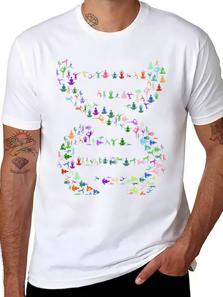 Show off your love for yoga with this unique black t-shirt! The shirt features a creative DNA helix design composed of colorful yoga poses. Each pose is depicted in vibrant hues, making the design eye-catching and fun. This tee is perfect for yoga enthusiasts and anyone who appreciates creative designs. The versatile black color makes it easy to pair with any outfit. Wear it to your next yoga class, casual outings, or simply lounging at home. Add a touch of zen to your wardrobe with this one-of-a-kind t-shirt.