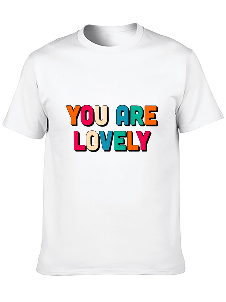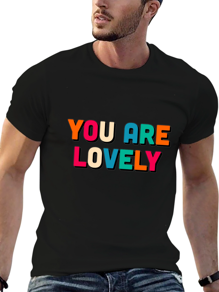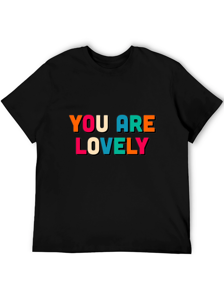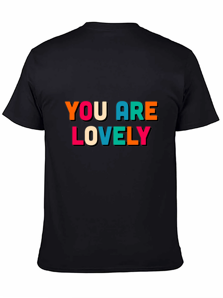 Spread positivity with this vibrant black t-shirt featuring the message "You Are Lovely" in a colorful, retro-inspired font. The shirt boasts bold lettering in shades of orange, teal, pink, and cream, set against a classic black background. Its simple yet eye-catching design makes it a versatile piece for everyday wear. Made from a comfortable, breathable fabric, this tee is perfect for casual outings, relaxing at home, or adding a touch of cheer to any outfit. Show the world some love with this unique and stylish t-shirt!