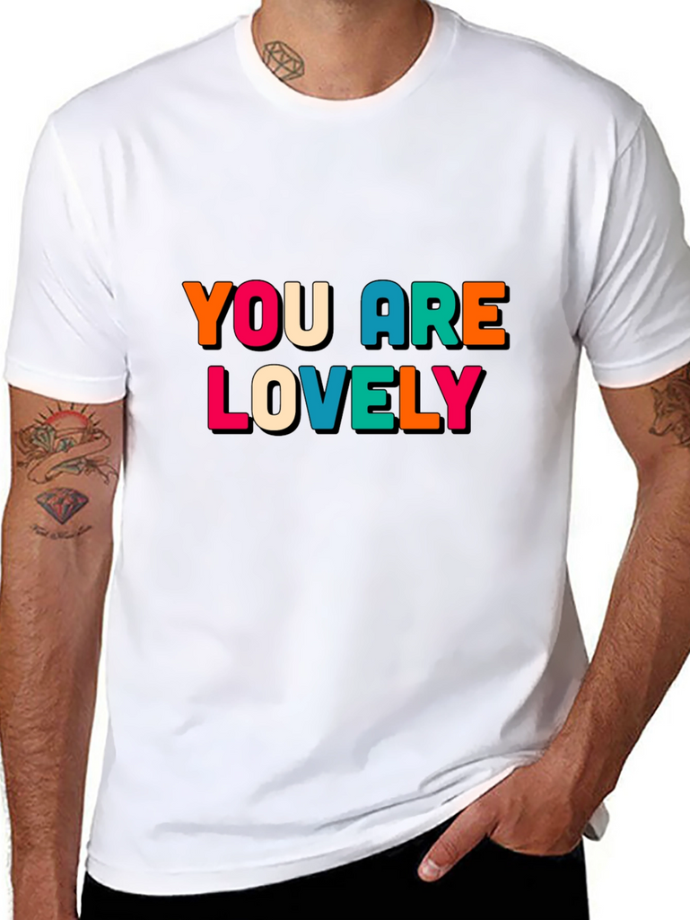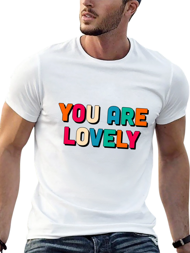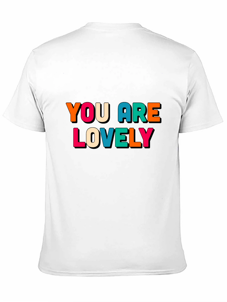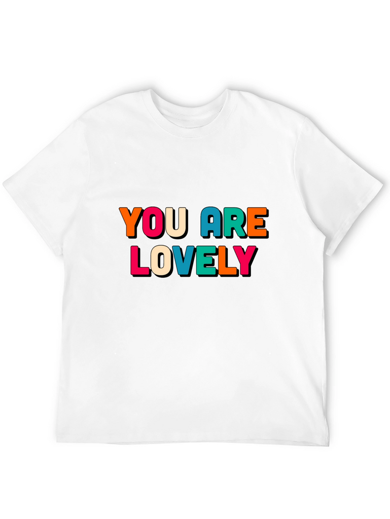 Spread positivity with this vibrant black t-shirt featuring the message "You Are Lovely" in a colorful, retro-inspired font. The shirt boasts bold lettering in shades of orange, teal, pink, and cream, set against a classic black background. Its simple yet eye-catching design makes it a versatile piece for everyday wear. Made from a comfortable, breathable fabric, this tee is perfect for casual outings, relaxing at home, or adding a touch of cheer to any outfit. Show the world some love with this unique and stylish t-shirt!