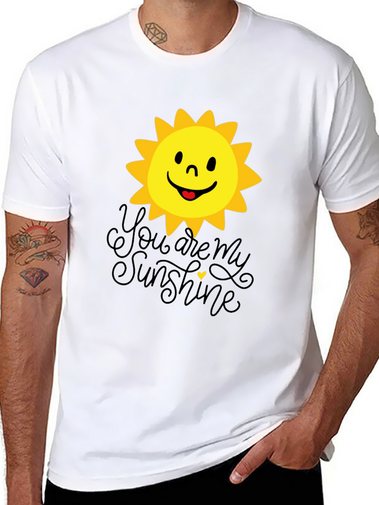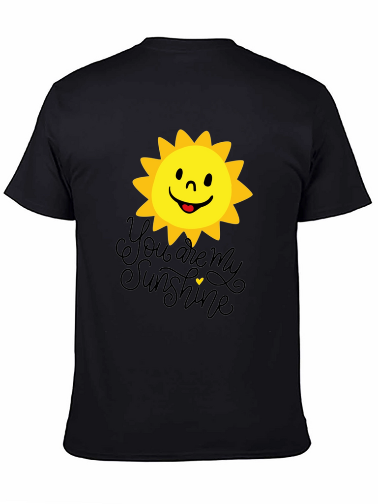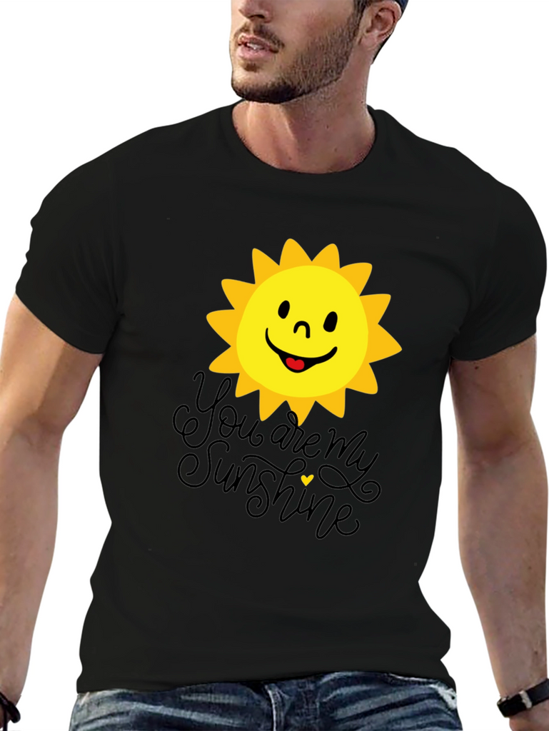 Brighten your day with this cheerful black t-shirt featuring a smiling yellow sun graphic. The playful design includes the phrase "You are my sunshine" in a charming script, accented with a tiny yellow heart. Made from a soft, comfortable fabric, this tee is perfect for everyday wear. Ideal for casual outings, lounging at home, or as a thoughtful gift for someone special. Spread positivity and warmth wherever you go with this adorable and stylish top. The short sleeves and relaxed fit make it a versatile addition to any wardrobe. Show off your sunny side!