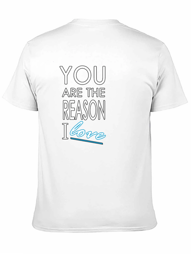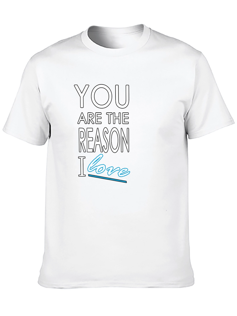 Show your love with this stylish black t-shirt featuring the phrase 'You are the reason I love' in a modern font. The design uses a classic sans-serif font with the word 'love' highlighted in a vibrant blue cursive. Made from comfortable material, this tee is perfect for casual wear or as a thoughtful gift for someone special. Pair it with jeans for a relaxed look or dress it up with a blazer. Let the world know what moves you with this statement shirt!