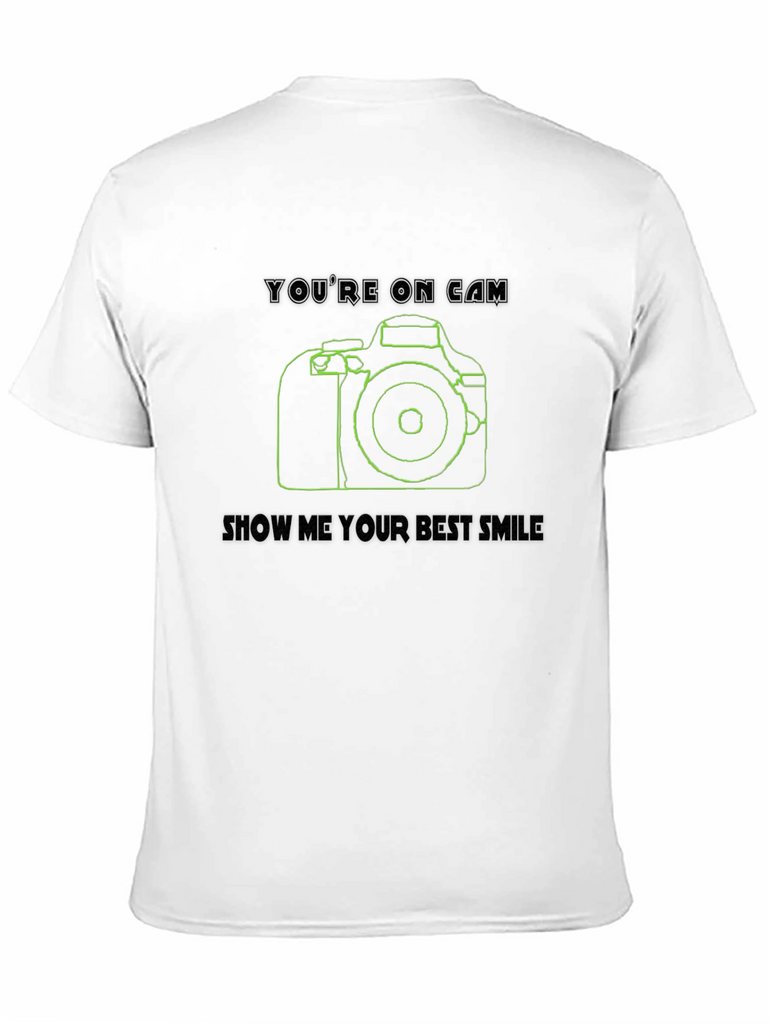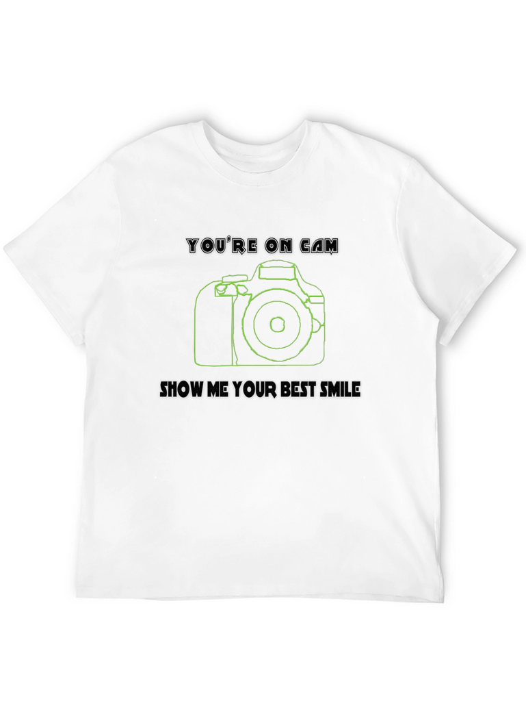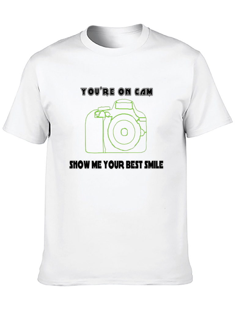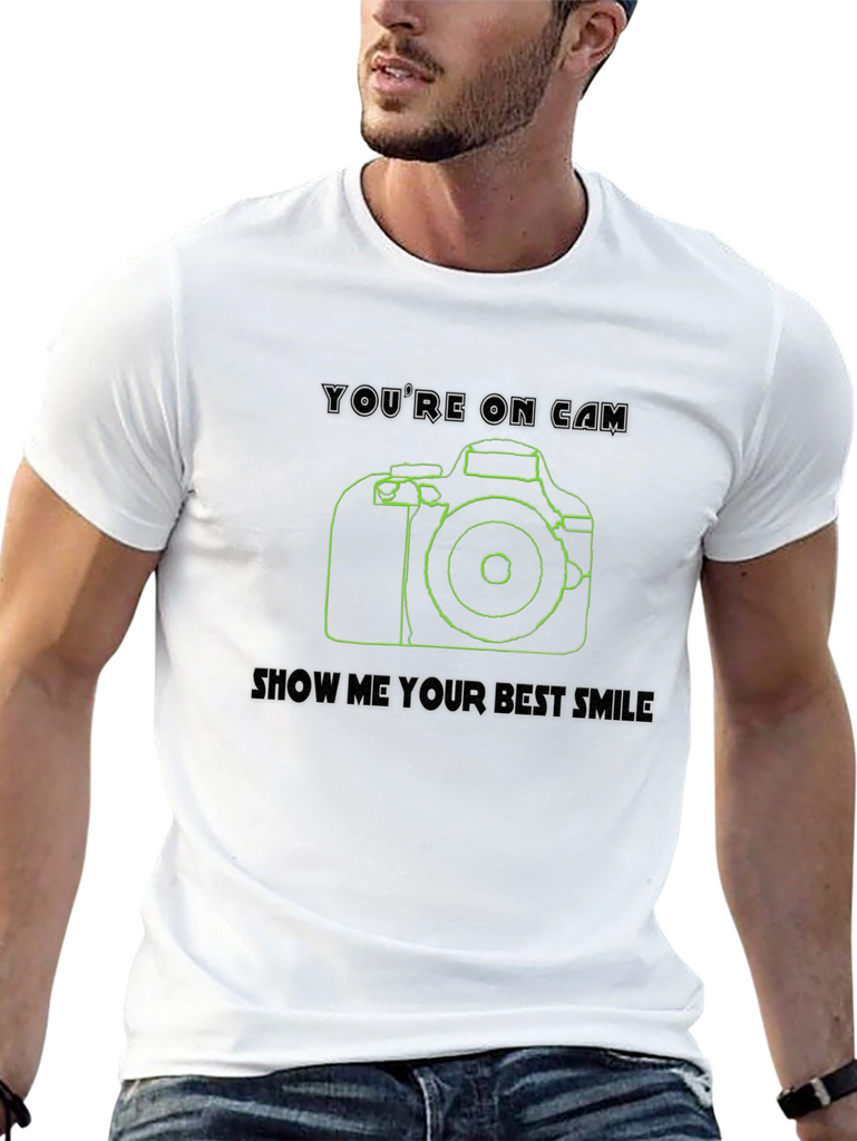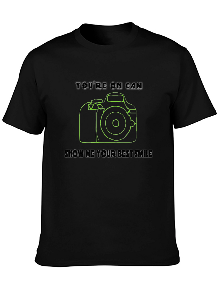 Capture attention with this stylish black t-shirt featuring a cool camera design! This shirt boasts a clean line-art style camera graphic in green, accompanied by the witty phrases "You're on Cam" and "Show Me Your Best Smile." Made from comfortable, breathable fabric, it's perfect for everyday wear or special occasions. The unique design makes it a great conversation starter for photographers, videographers, or anyone who loves a touch of visual flair. Whether you're hitting the streets for a photoshoot or simply want to express your passion for photography, this tee is a perfect choice. Grab yours and get ready to capture some smiles!