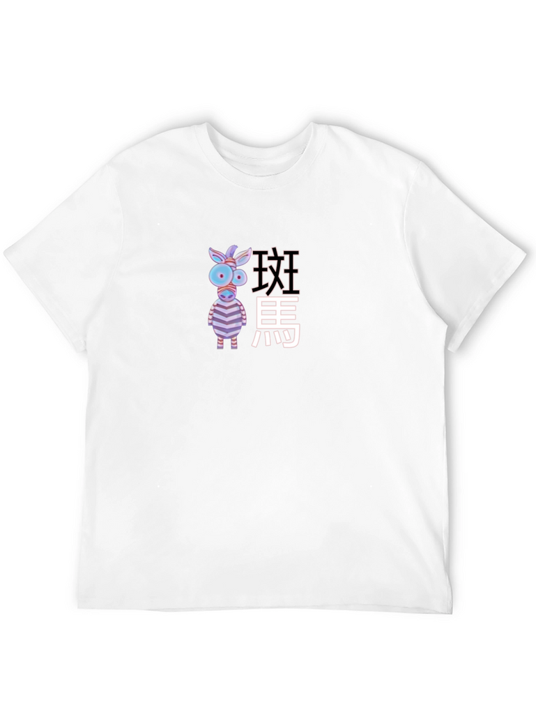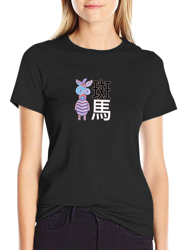 This stylish black tee features a quirky cartoon zebra graphic, accompanied by text in perhaps an asian language. The design is playful and eye-catching. Made from what appears to be a soft, comfortable fabric, this t-shirt is ideal for casual wear. The tee has a classic fit with short sleeves, making it a versatile addition to any wardrobe. Perfect for expressing your unique style or as a fun gift for animal lovers! This graphic t-shirt will make sure you stand out from the crowd.