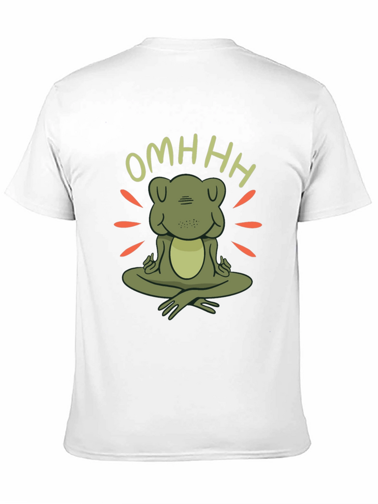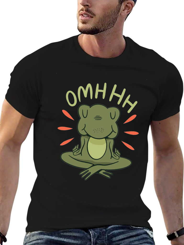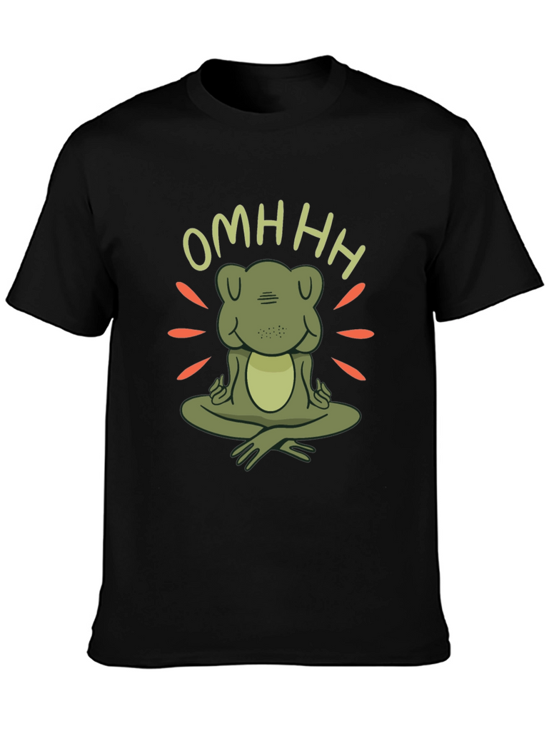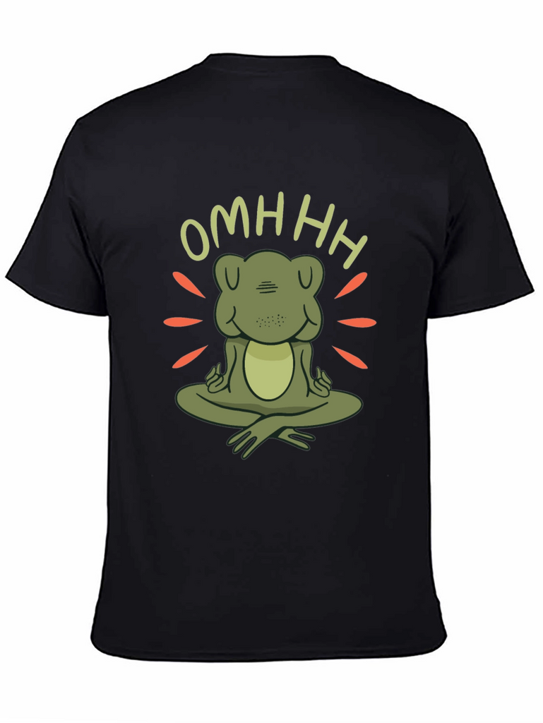 Find your inner peace with this unique zen frog t-shirt. Featuring a charming cartoon frog in a meditative pose with the word "OMHHH" above, this t-shirt is sure to bring a touch of whimsy and tranquility to your wardrobe. The design incorporates radiating lines around the frog, creating a peaceful, zen-like atmosphere. Made from comfortable, soft fabric, this black t-shirt is perfect for yoga sessions, casual outings, or simply lounging at home. Show off your love for mindfulness and adorable amphibians with this one-of-a-kind graphic tee. A great conversation starter and a perfect gift for the zen enthusiast in your life.