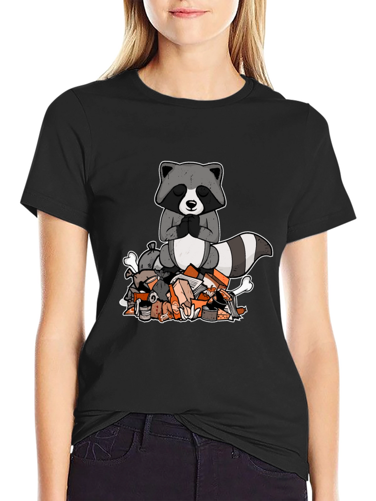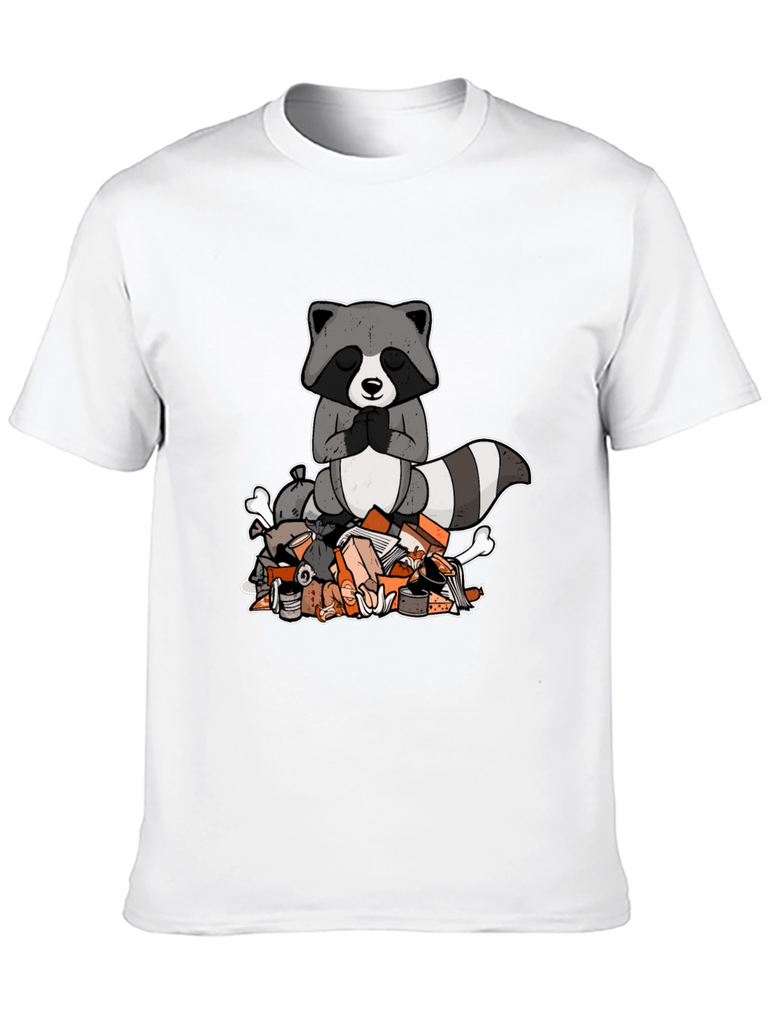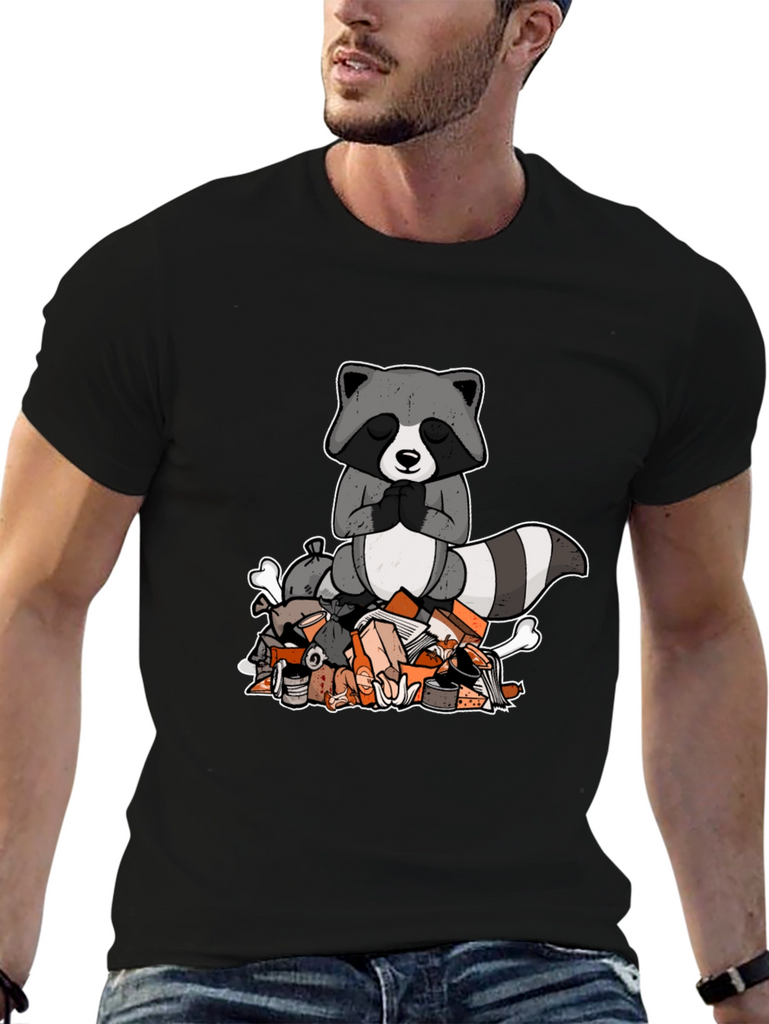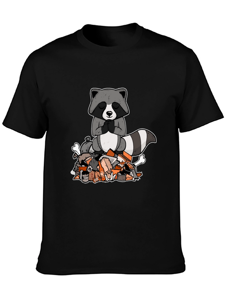 Embrace humor and unique style with this eye-catching black t-shirt. It features a cartoon raccoon sitting cross-legged atop a pile of trash in a meditative pose. The raccoon, rendered in grayscale with striking black outlines, offers a touch of zen amidst chaos. Crafted from comfortable and breathable fabric, this tee ensures all-day comfort. Perfect for casual wear, it's a conversation starter and a fun way to express your quirky personality. Show off your distinctive style and a love for wildlife with this one-of-a-kind graphic tee.
