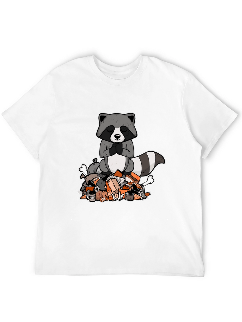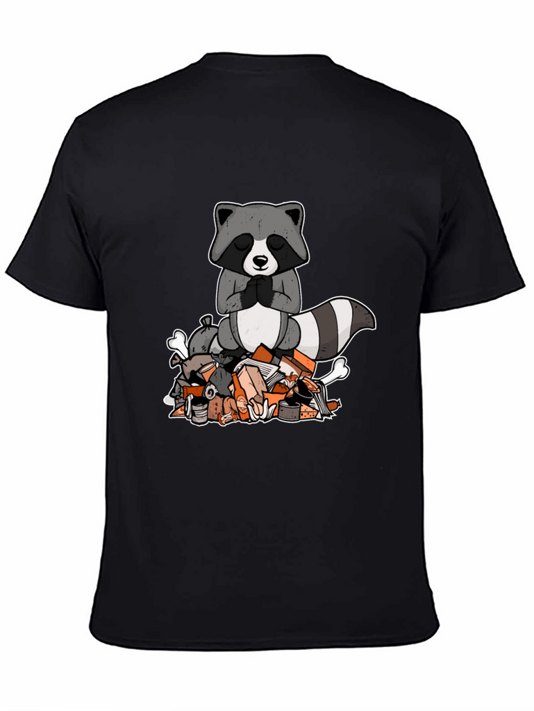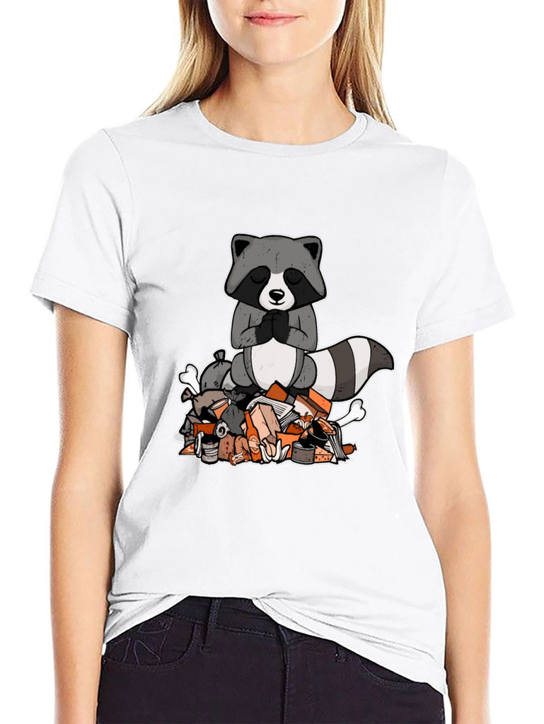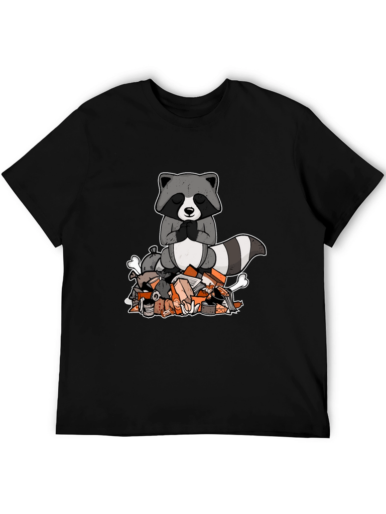 Embrace humor and unique style with this eye-catching black t-shirt. It features a cartoon raccoon sitting cross-legged atop a pile of trash in a meditative pose. The raccoon, rendered in grayscale with striking black outlines, offers a touch of zen amidst chaos. Crafted from comfortable and breathable fabric, this tee ensures all-day comfort. Perfect for casual wear, it's a conversation starter and a fun way to express your quirky personality. Show off your distinctive style and a love for wildlife with this one-of-a-kind graphic tee.