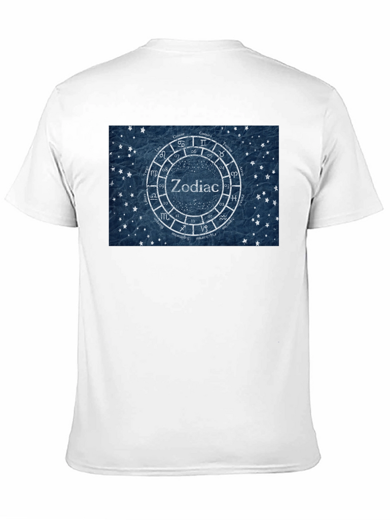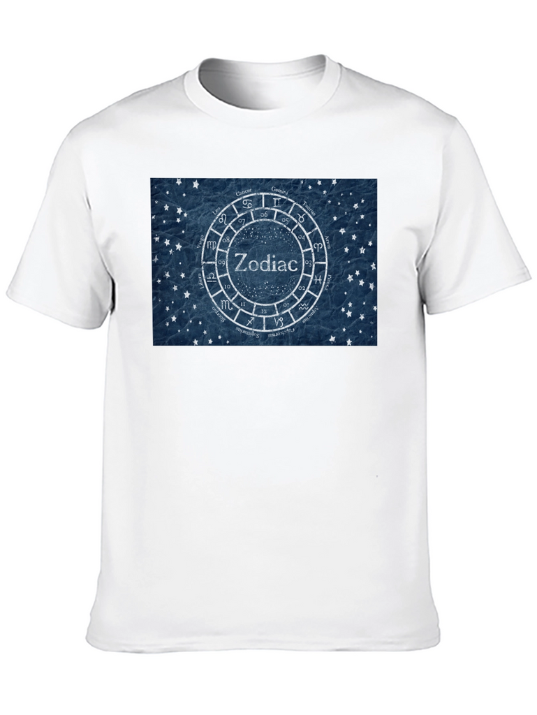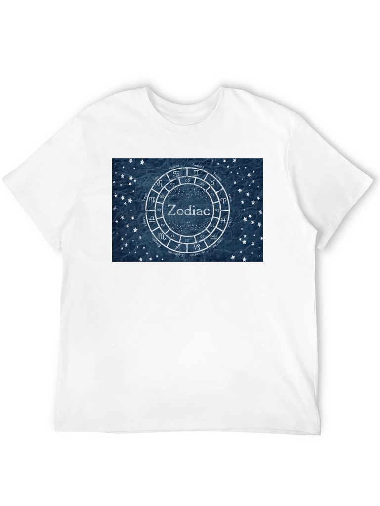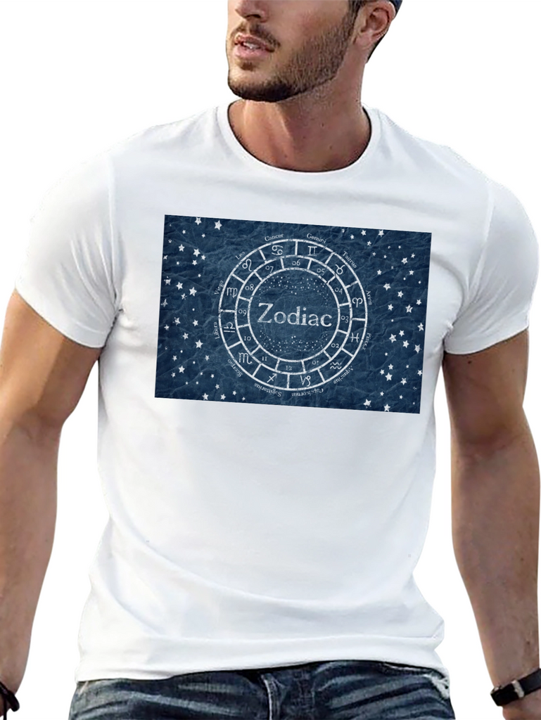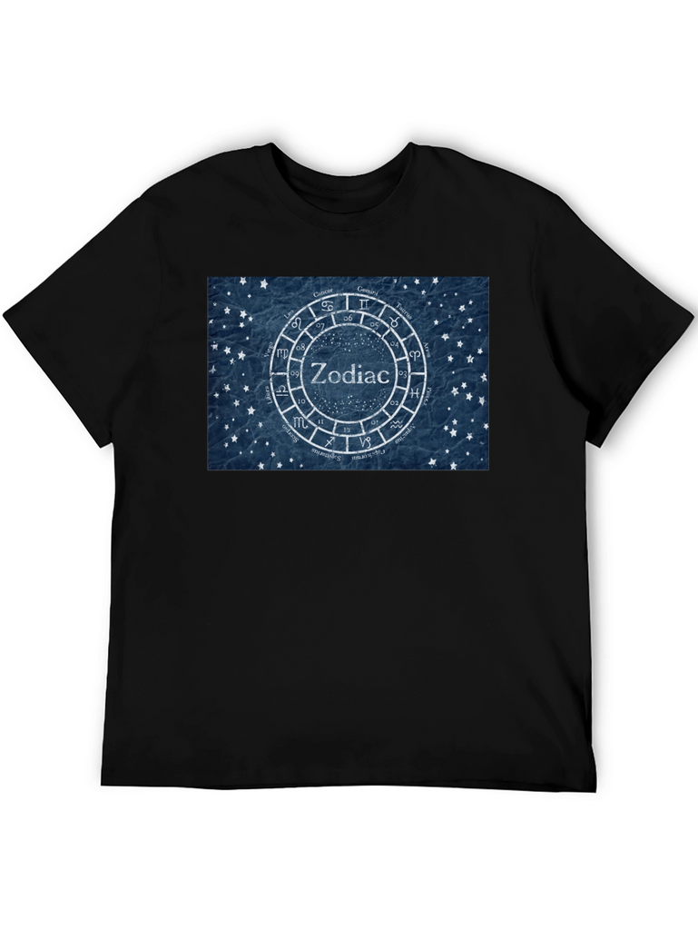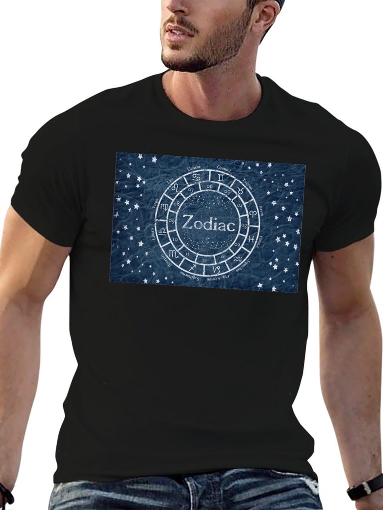 Showcase your love for astrology with this stylish black t-shirt. The tee features a unique zodiac wheel design with the symbols of the twelve astrological signs surrounding the word "Zodiac" in the center. The design is rendered on a textured blue background with small star details, giving it a vintage yet modern feel. Made from comfortable cotton fabric, this t-shirt is perfect for everyday wear. Whether you're an astrology enthusiast or simply appreciate eye-catching designs, this t-shirt is a great addition to your wardrobe. It is also a great birthday gift for astrology lovers. Pair it with jeans or shorts for a casual look that expresses your unique personality.